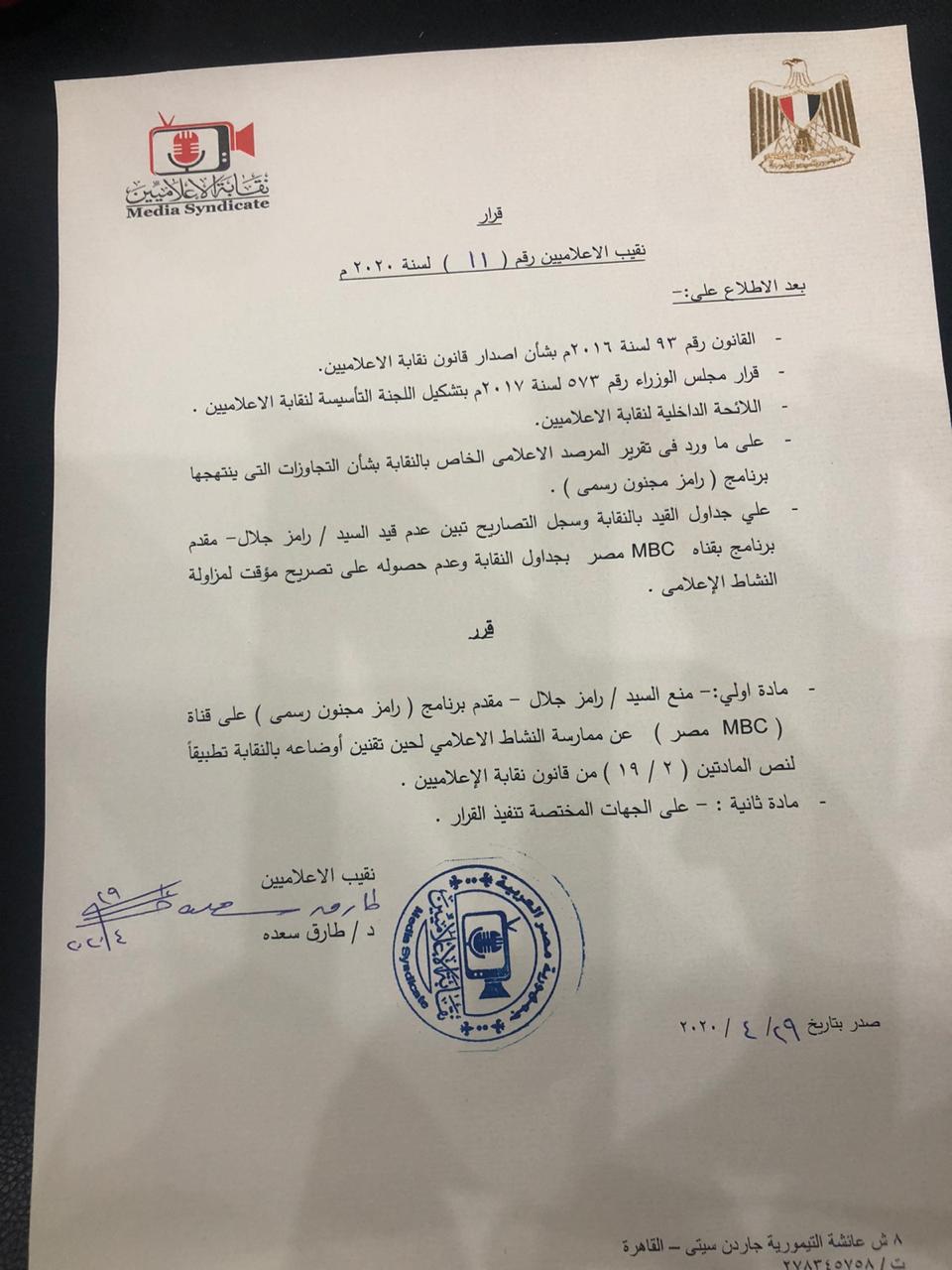 وفي أول رد رسمي قرر طارق سعدة نقيب الإعلاميين المصريين منع ظهور جلال على أية وسيلة إعلامية تبث داخل مصر لحين توفيق أوضاعه القانونية.