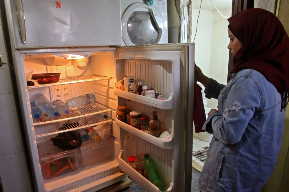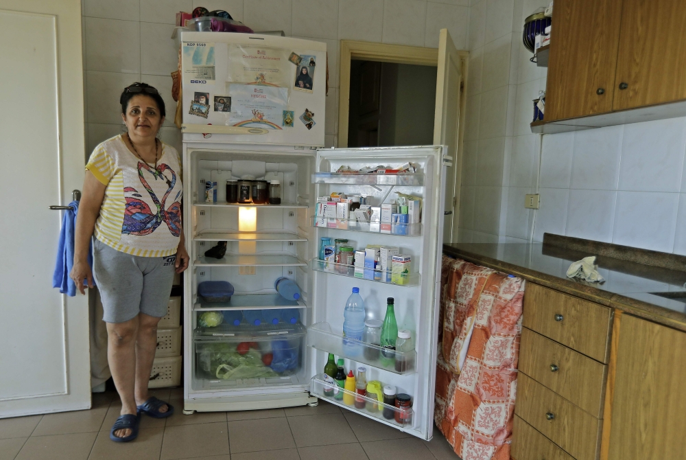 أمام باب برادها المفتوح وفيه عبوة مياه وحبتين من الخيار فقط، تروي فدوى المرعبي (60 عاماً) المقيمة في منزل متواضع في مدينة طرابلس شمالاً أنها باعت برادها الكبير العام الماضي لأنها لم تكن قادرة على تخزين الكثير فيه واشترت آخر أصغر حجماً.