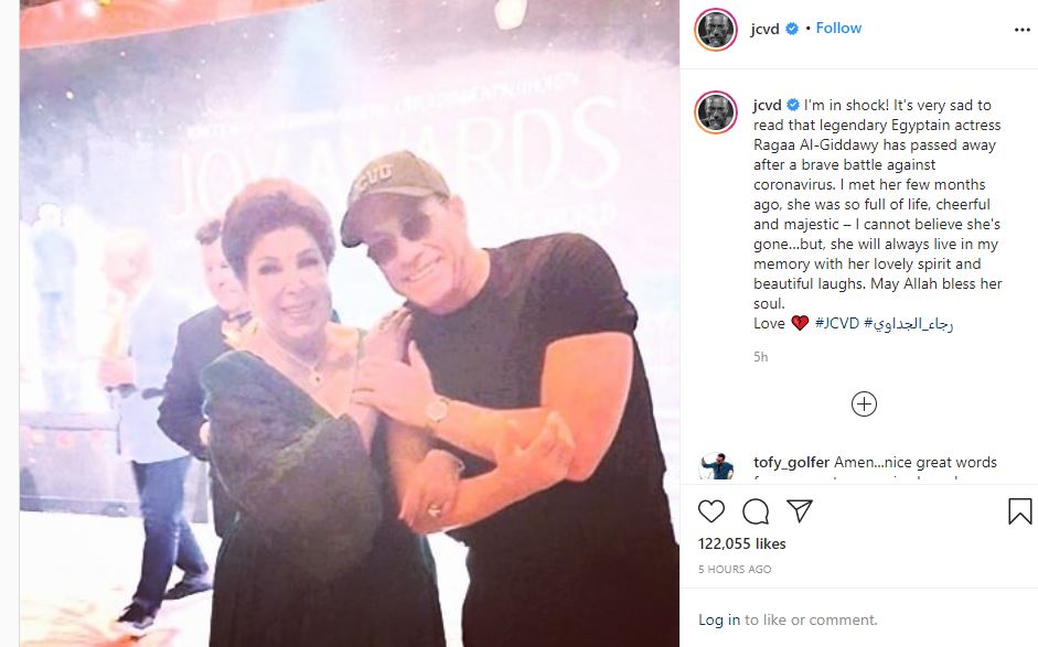 وكتب فاندام، المشهور بأفلام الحركة، عبر صفحته الخاصة على "إنستغرام": "أنا مصدوم.. إنه لأمر محزن للغاية أن تقرأ أن الممثلة المصرية الأسطورية رجاء الجداوي قد توفت بعد معركة شجاعة ضد الفيروس التاجي. التقيت بها قبل بضعة أشهر، كانت مليئة بالحياة، مبتهجة ورائعة. لا أستطيع أن أصدق أنها رحلت.. ولكن، ستعيش دائما في ذاكرتي بروحها الجميلة والضحك الجميل. ليبارك الله روحها".