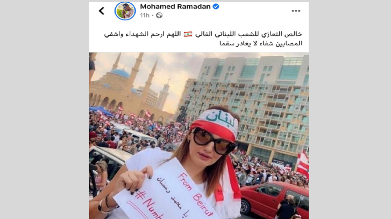ونشر محمد رمضان عبر صفحته على «فيس بوك»: «خالص التعازي للشعب اللبناني الغالي، اللهم ارحم الشهداء واشفِ المصابين شفاء لا يغادر سقماً». وأرفق تعليقه بصور لفتاة لبنانية تحمل لافتة كتب عليها «منحبك يا محمد رمضان.. نمبر وان».
