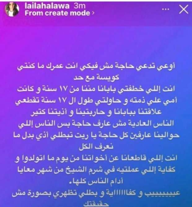 وكتبت ليلى مخاطبة ياسمين قائلة: «إوعي تدّعي حاجة مش فيكي أنت عمرك ما كنتي كويسة مع حد.. أنت اللي خطفتي بابانا مننا من 17 سنة، وكانت أمي على ذمته وحاولتي طول الـ17 سنة تقطعي علاقتنا ببابانا وحاربتينا وأذتينا كتير».