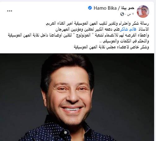 حمو بيكا قال عبر صفحته على «فيس بوك»: «رسالة شكر واحترام وتقدير لنقيب المهن الموسيقية أمير الغناء العربي الاستاذ هاني شاكر على دعمه الكبير لمغنيين ومؤديين المهرجان، وإعطاء الفرصة لهم للانضمام لشعبة (المونولوج) لتقنين أوضاعنا داخل نقابة المهن الموسيقية، والتحكم في الكلمات والموسيقى وشكر خاص لأعضاء مجلس نقابة المهن الموسيقية».