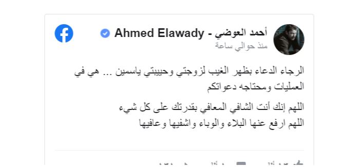 وكتب العوضي، عبر صفحته الرسمية في «فيسبوك»: «الرجاء الدعاء بظهر الغيب لزوجتي وحبيبتي ياسمين.. هي في العمليات ومحتاجة دعواتكم.. اللهم إنك أنت الشافي المعافي بقدرتك على كل شيء.. اللهم ارفع عنها البلاء والوباء واشفيها وعافيها».