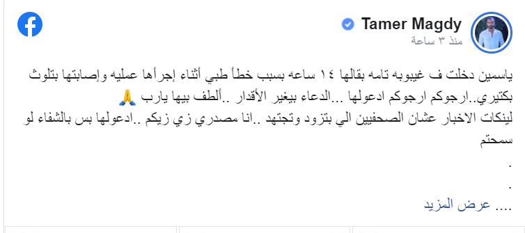 وقال مجدي عبر حسابه في «فيس بوك»: «ياسمين دخلت في غيبوبة تامة بقالها 14 ساعة بسبب خطأ طبي أثناء إجرائها عملية.. أرجوكم ارجوكم ادعولها..الطف بيها يارب».