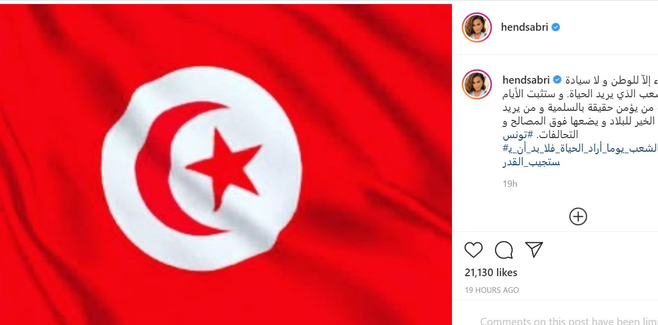 تفاعلت الفنانة هند صبري، مع الاحداث السياسية الراهنة في بلدها تونس والقرارات الاخيرة للرئيس قيس سعيد، موجهة رسالة للشعب التونسي.
