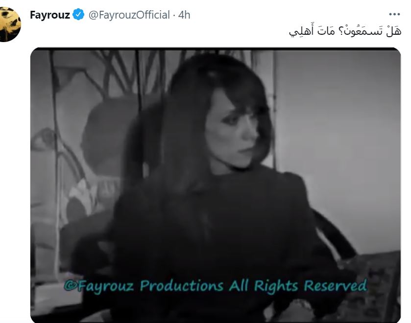 ونشرت فيروز وذلك عبر حسابها الرسمي في «تويتر» مقطعا من اغنيتها الشهيرة «في ظلام الليل» التي تقول كلمات مطلعها: «في ظلام الليل أناديكم.. هل تسمعون؟ مات أهلي«.. وغمرت بلادنا دموع ودماء». وعلقت فيروز على مقطع الفيديو بالقول» مات أهلي.. هل تسمعون".