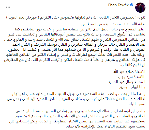 وكتب إيهاب توفيق عبر حسابه الشخصي بموقع التواصل الاجتماعي فيس بوك منشورا يوضح فيه حقيقة ما يتردد وقال: تنويه بخصوص الأخبار الكاذبة التي تم تداولها بخصوص حفل التكريم بمهرجان نجم العرب، بداية الأمر عند صعود سيدة من المنظمين على المسرح في بداية الحفل الذي تأخر عن ميعاده ساعتين، أخذ دور «النباطشي» كما نشاهده في الأفراح الشعبية.