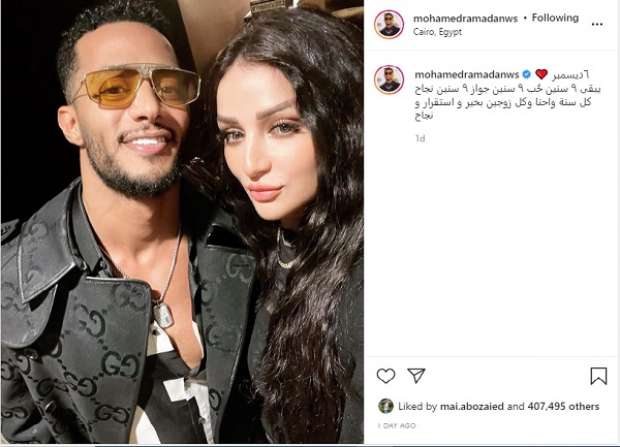 واحتفل محمد رمضان أمس بعيد زواجه التاسع، ونشر عبر حسابه الرسمي على موقع التواصل الاجتماعي «انستغرام» صورة تجمعه بزوجته، وعلق عليها قائلًا: «6 ديسمبر يبقى 9 سنين حُب 9 سنين جواز ٩ سنين نجاح كل سنة وإحنا وكل زوجين بخير واستقرار ونجاح».
