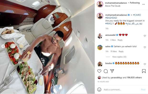وحسب صحيفة الوطن المصرية ، نشر محمد رمضان صور له أثناء تناوله الطعام من داخل طائرته الخاصة عبر حسابه الرسمي على موقع الصور والفيديوهات الشهير «انستغرام»، وعلق على الصور قائلًا: «من القاهرة إلى بغداد، هل أنتم مستعدين لأكبر حفلة في العراق؟»، ليرد عليه أحد متابعيه: «منتظرينك».