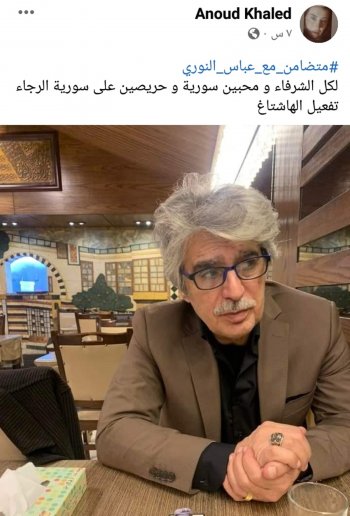 وجاء الهاشتاغ بطلب من زوجته الكاتبة عنود الخالد، حيث نشرت عبر صفحتها صورة للنوري وعلقت بالقول: "لكل الشرفاء ومحبين سورية والحريصين على سورية الرجاء تفعيل هاشتاغ #متضامن_مع_عباس_النوري".