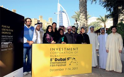 لقطة جماعية للمخرجين المشاركين بمسابقة «المهر الإماراتي» فــــــــــــــــــــــــــــــــــــــي «دبي السينمائي». تصوير : باتريك كاستيلو
