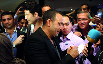 أحمد السقا وأحمد عز خلال حضـــــــــــــــــــــــــــــــــــــــــورهما افتتاح عرض «المصلحة» في دبي. تصوير: أسامة أبوغانم