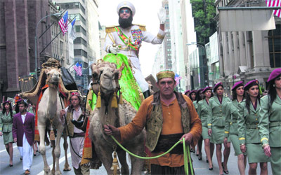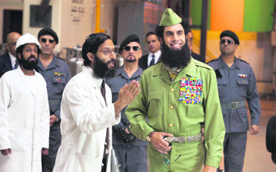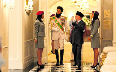 لا حاجة لاتباع الديكتاتور بوصف «العظيم» كما فعل شارلي شابلن في فيلمه الشهير «الديكتاتور العظيم» ،1940 بل حذف ذلك الوصف، والمضي مع ساشا كوهين وجديده The Dictator «الديكتاتور» من دون أي وصف آخر، وقد وجد ضالته في دولة يطلق عليها «واديا» أو «وديع» التي على ما يبدو تقع في شمال إفريقيا ويحكمها علاء الدين (كوهين)، الذي يتكلم الإنجليزية بلكنة عربية مبالغ فيها، وحين يتكلم لغته تبدو قرقعة أصوات تتسيدها الخاء والعين، كما «بورات» عنوان فيلمه عام 2006 والشخصية الكازاخية العجيبة التي عرف بها على صعيد واسع.