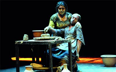 الانفتاح على عالم من المنتجات الفخارية التقليدية وآلة قديمة لصناعة الفخار، وغبار يملأ المكان إثر استخدام مكونات الفخار، فضلاً عن الإضاءة الموحية أحالت المشاهد مباشرة إلى طقوس جعلته ينسى كل ملامح الحداثة التي طالعها منذ خروجه من بيته أو عمله قاصداً مسرح دبي الاجتماعي في «مول الإمارات»، ما يستدعي مروره بشارع الشيخ زايد، المزدهر بشواهد نهضة عمرانية تعد مثالاً حياً لحضارة القرن الجديد، ما يعني أن لحظة إزاحة الستار هي لحظة إبحار في مساحة مكانية وزمانية جديدة.