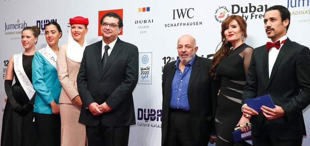 محمد خان متوسطاً عدداً من أبطال الفيلم على سجادة المهرجان الحمراء. تصوير: أحمد عرديتي