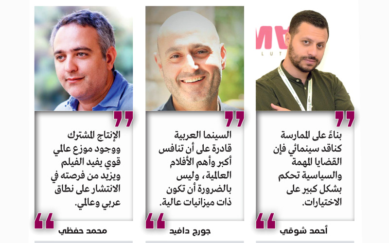 وعن دور شركات الانتاج والتوزيع في دعم الفيلم العربي وايصاله للعالمية، قال السيناريست والمنتج صاحب شركة «فيلم كلينيك» محمد حفظي، الذي ساهم بإنتاج أفلام عربية تم عرضها حول العالم وشاركت في مسابقات عالمية مثل فيلم «اشتباك» الذي افتتح قسم «نظرة ما» في الدورة الفائتة من مهرجان كان السينمائي «المعيار الأهم هو جودة الفيلم بمستوى عناصره من كتابة واخراج وتمثيل، بالطبع هناك عوامل تفضل بعض الأفلام على الأخرى في حالة تقارب مستواها، خصوصاً اسم وتاريخ المخرج، مؤكدا «بالطبع الانتاج المشترك ووجود موزع عالمي قوي يفيد الفيلم ويزيد من فرصته في المشاركة في المهرجانات الكبرى، حيث نجد أن معظم الأفلام التي شاركت في المهرجانات الكبرى مثل (كان) على سبيل المثال هي أفلام أنتجت بالمشاركة مع فرنسا ولديها موزع عالمي من الشركات الفرنسية».