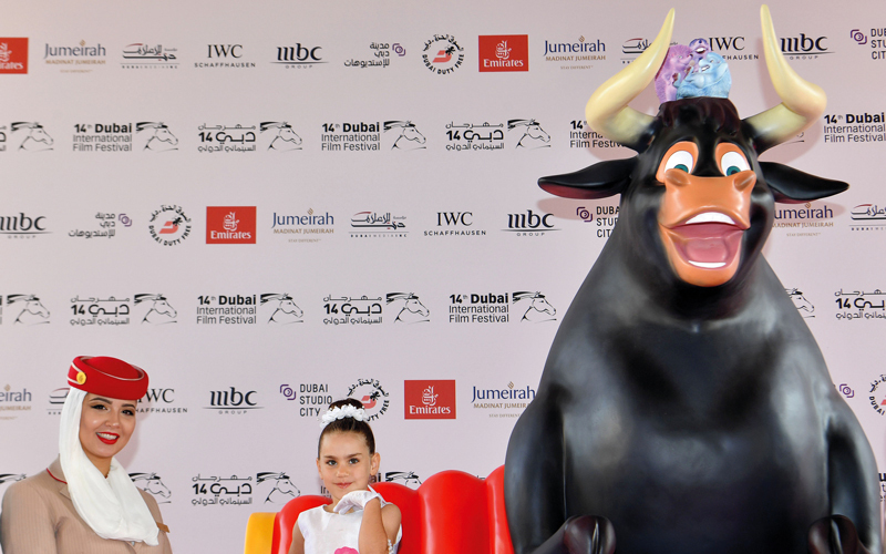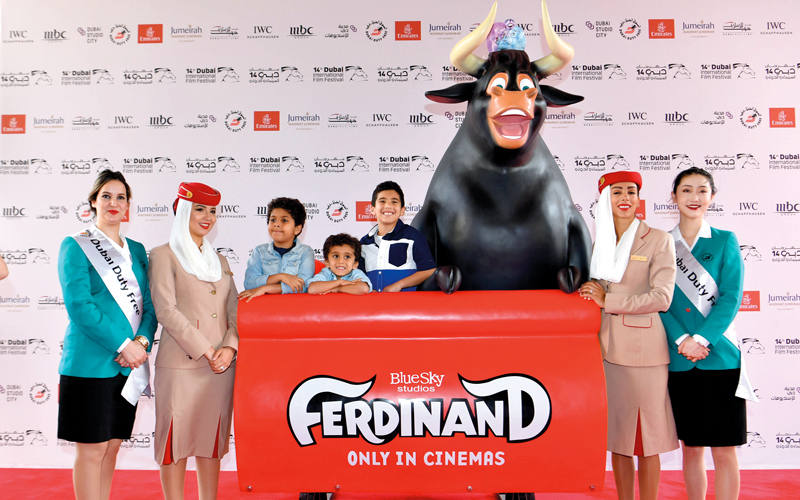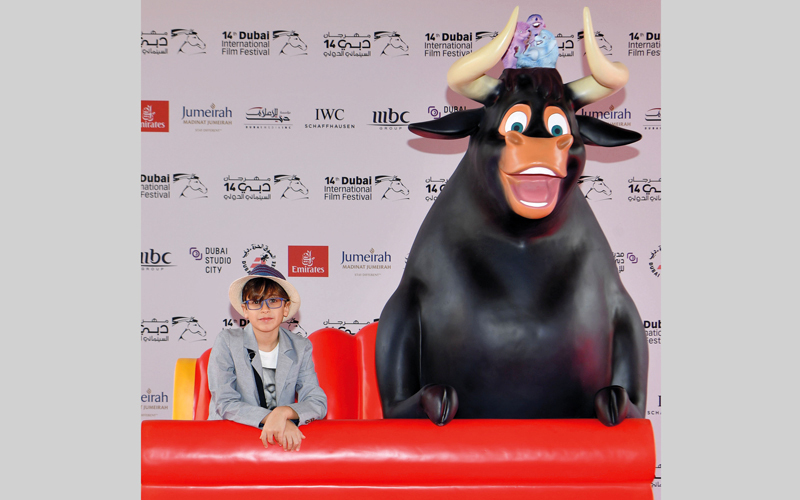 مشى الأطفال وهم يرتدون أجمل الملابس على السجادة الحمراء، التي تزينت بمجسم الثور الإسباني، الشخصية الرئيسة لفيلم «فيرديناند»، فيلم افتتاح سينما الأطفال في الدورة الـ14 من مهرجان دبي السينمائي.