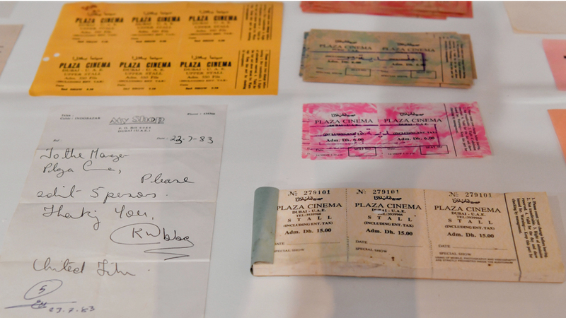 تقريباً كل ما يتعلق بالسينما يمكن لزائر المعرض أن يجده ماثلاً أمامه، حتى المقاعد الخشبية التي كان يجلس عليها رواد السينما قديماً، حولها عمار العطار إلى عمل فني في إحدى قاعات العرض، وعلى الجدار المقابل علقت مجموعة كبيرة من ملصقات الأفلام الهندية «البوسترات» تحمل صور وأسماء نجوم السينما الهندية في السبعينات والثمانينات مثل ملصق فيلم «سوراج» إلى جانب أفلام من مصر وبنغلاديش وهوليوود وباكستان. كذلك ضم المعرض، الذي يستمر حتى 5 نوفمبر المقبل، مجموعة من الوثائق القديمة، وهي جانب من مخاطبات رسمية بين دار عرض «سينما بلازا» من جهة وبلدية دبي أو وزارة الإعلام والثقافة من جهة أخرى، ومن بينها خطاب صادر من بلدية دبي في فبراير 1977، يفيد بموافقة البلدية على رفع أسعار تذاكر الدرجة الثانية في السينما من ثلاثة دراهم ونصف الدرهم إلى أربعة دراهم، ورفع أسعار تذاكر الدرجة الثالثة من درهمين ونصف الدرهم إلى ثلاثة دراهم ونصف الدرهم، أسوة ببقية دور العرض الأخرى، وخطاب آخر من البلدية يفيد بالموافقة على طلب «سينما بلازا» بعرض فيلم «طرزان» لأطفال إحدى المدارس في دبي مجاناً، «وذلك إسهاماً من السينما في الترويح عن الأطفال»، وهو ما يلقي بالضوء على وظيفة دور العرض في ذلك الوقت، التي لم تكن فقط عرض الأفلام داخل قاعاتها، لكنها كانت تسهم في خلق حراك فني ثقافي ترفيهي في المجتمع. وخطاب آخر يعود إلى ديسمبر 1975، صادر عن رقابة الأفلام بوزارة الإعلام والثقافة في ذلك الوقت، ويطالب مدير السينما بدفع مبلغ قدره 300 درهم بدل رسوم عن الأفلام التي تمت مراقبتها في شهر نوفمبر من العام نفسه. إلى جانب مجموعة كبيرة من دفاتر تذاكر السينما، وصور من داخل غرفة عرض الأفلام وصور لدور السينما من الداخل والخارج، وكذلك قصاصات من صحف ومجلات مختلفة تضم مواد مرتبطة بالسينما مثل إعلانات الأفلام ومقالات نقدية وأخبار متنوعة، وغيرها.