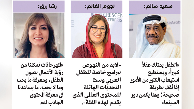 وطالب المختصون والفنانون الذين استطلعت «الإمارات اليوم» آراءهم حول واقع سينما الطفل العربي والتحديات التي تواجهها، بضرورة تفعيل دور الجيل الجديد وإشراكه في اختيار المحتوى الذي يتناسب مع القيم العربية والإنسانية، مشددين على أن طفل اليوم الذي يجيد التعامل مع التكنولوجيا والأجهزة الحديثة وعالم الإنترنت يختلف تماماً عن طفل الأمس، وهو ما يستدعي من صناع المحتوى العربي المقدم إلى هذه الفئة تطوير أدواتهم، واحترام عقلية الأطفال وتطلعاتهم.