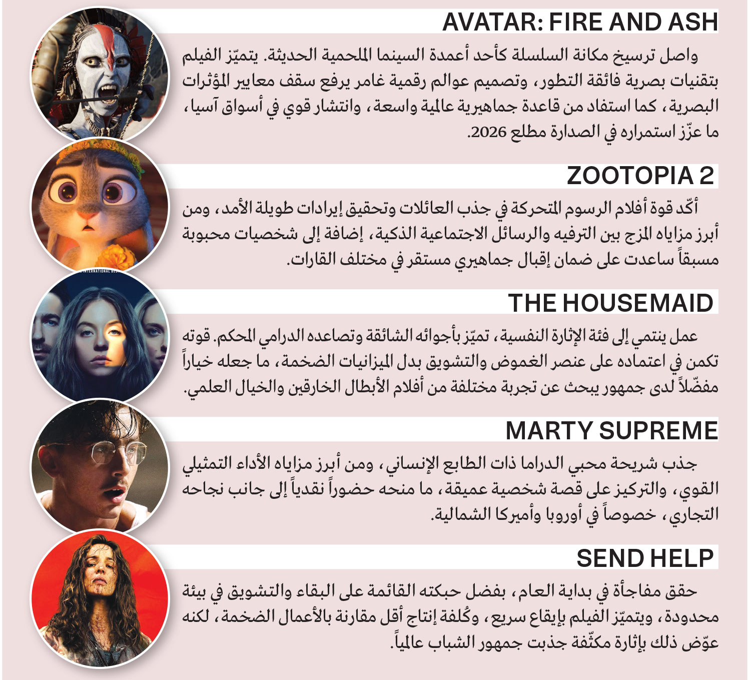 تُظهر قائمة الأفلام المتصدرة تنوّعاً واضحاً في الأنماط السينمائية بين الخيال العلمي، والرسوم المتحركة، والإثارة النفسية، والدراما الإنسانية، وأفلام البقاء، وهو ما يؤكد أن صدارة شباك التذاكر العالمي في 2026 لم تكن حكراً على نوع واحد، بل نتيجة مزيج من القوة الإنتاجية، والرهان على العلامات التجارية، وتلبية أذواق جماهير متعددة حول العالم. فيما يأتي خمسة من أبرز هذه الأعمال ومزايا كلّ منها.