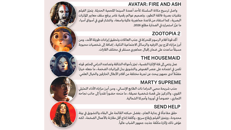 مع بداية عام 2026 برزت مجموعة من الأفلام التي تصدّرت شباك التذاكر عالمياً، ليس فقط بحجم إيراداتها، بل أيضاً بخصائص فنية وتسويقية عزّزت حضورها الدولي.