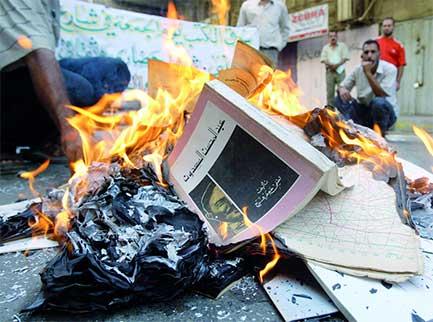 مثقفون عراقيون يحرقون مكتباتهم احتجاجاً على جرائم الاحتلال. أ.ف.ب