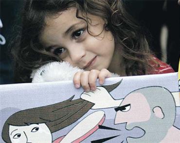 طفلة لبنانية تحمل ملصقاً رافضاً للعنف الأسري تزامناً مع الاحتفالات التي تقام في دول العالم بمناسبة يوم الطفل العالمي الذي احتفل فيه العالم امس بمظاهرات وندوات وأنشطة متنوعة، وتؤكد تقارير الامم المتحدة أن الاطفال حول العالم لا يزالون حتى هذه اللحظة يعانون العنف، والجوع، والتشرد، وممارسة الاعمال الصعبة في سن مبكرة.
