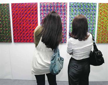 ليس صعبا أن يلاحظ الزائر للمعرض أن التكرار في العمل هو السائد والمقصود، حسب مخلوف التي قالت لـ«الإمارات اليوم» «وجدت أن الحوار يجب أن يتجسد من خلال لوحات تكرر نفسها من حيث الشكل، وتتحاور فيما بينها من حيث الاختلاف في الألوان، ولمسات خاصة أمنحها للوحتي الفنية».