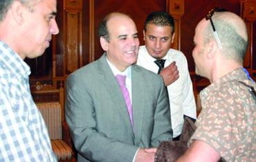 حمراوي يتوسط عددآً من الصحافيين بعد مؤتمره الصحافي. من المصدر