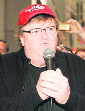 المخرج الأميركي مايكل مور في تظاهرة شهدتها أول من أمس «وول ستريت» في نيويورك. ويبدأ غداً عرض فيلمه الجديد «الرأسمالية.. قصة حب» في الولايات المتحدة.