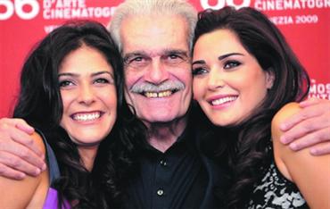عمر الشريف يتوسط سيرين عـــــــــــــــــــــــــــــــــبدالنور وبسمة خلال عرض الفيلم في فينيسيا. أ.ب