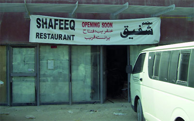 علق صاحب هذا المطعم ليخبر المارة بأن افتتاح مطعمه سيكون قريباً، لكنه كتب على اللافتة «عنقريب افتتاح» بدلاً من «الافتتاح قريباً»، ما يدل على عدم الاهتمام باللغة العربية.