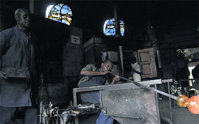 فنانون يصنعون أشكالاً زجاجية في ورشة كيتنغيلا، التي تبعد نحو 30 كيلومتراً عن نيروبي العاصمة الاوغندية، والتي تملكها وتديرها فنانة الجداريات ناني كروز 67 عاماً. ووتستقطب الصناعات الزجاجية التي تقدمها هذه الورشة جمهوراً كبيراً من الزوّار والمتحمسين لهذا النوع من الفنون الذي يتطلب جهداً كبيراً في إنجازه.