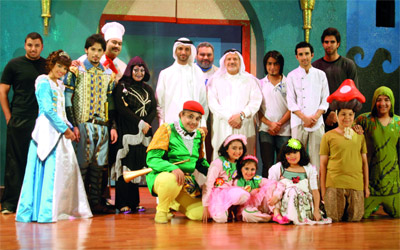 محمد بن جرش يتوسط أعضاء الفرقة المسرحية. من المصدر