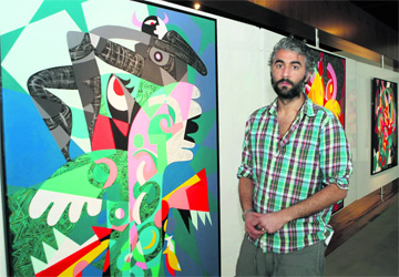 عند التحدث عن الزمان والمكان لا يمكن فصل المرأة ابداً، فهي أكثر من يعبر عن كل الحالات التي طرأت على الأمكنة والأزمنة، لأنها باختصار وفي الاساس صاحبة قضية، هذا ما يؤكده الفنان العراقي المقيم في باريس اثير الذي يشارك بست لوحات اعتمدت جميعها على ثيمة المرأة بأشكال مختلفة، وما تتعرض له خصوصاً المرأة العراقية التي تعيش الاحتلال بكل اشكاله، فتراها تغطي نفسها من تمساح مفترس تارة، وتراها في لوحة اخرى مجتمعة مع نسوة يتوشوشن بحال بلادهن، وفي تارة اخرى تراها تبكي مقهورة على فقيد غالٍ، لكن أثير صَوّر المرأة في كل أعماله يائسة وخائفة وخاضعه «أنا أصورها من رؤيتي العاطفية لها وخوفي عليها، حيث عندما علمت بموضوع المعرض لم يخطر ببالي الا وجهها القابع تحت البنادق من كل صوب». الوان أثير، وعلى الرغم من سوداوية موضوعاته، ألوان جريئة ومفعمة بالحيوية «استخدم الاكليريك، واخترت الواناً صارخة لتظهر معاني الوجوه المخبأة بشكل سلس»، ومن اللافت استخدامه للالوان التي يطلق عليها الفوسفورية، التي تعطي اشعاعا قويا مقارنة بالالوان الاخرى، «هذه النقطة كي يقف المشاهد ويحاول ان يدخل في قلب اللوحات اكثر».