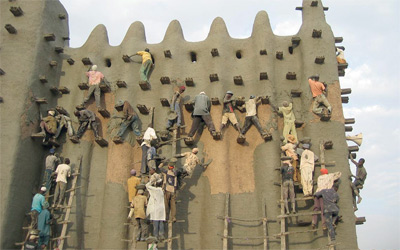فجر يوم الترميم تتحول المنطقة إلى خلية نحل منذ الفجر، وفود جماعية، يحدوها أناس يدقون على الطبول، ويطلقون هتافات حماسية كأنها آتية من أدغال غابات إفريقيا، مختلطة ببعض العبارات الإسلامية، وأناس يجهزون الطين الذي سيرمم به المسجد، وبناؤون يصعدون السلام، وأطفال وشباب يحملون الطين لتوصيله إلى البنائين.