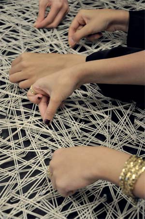 العمل موزع على لوحتين مربعتين يبلغ طول كل منهما 122 سنتيمتراً. أما عن ألوانه فهو لا يزيد على تداخل بين الأبيض والأسود، وقد تم رسم شبكة بقلم الرصاص مساحتها 25 سنتيمتراً مربعاً على السطح تحيط بها حاشية بعرض 10 سنتيمترات. وعند كل نقطة تقاطع بين خطين تم دق مسمار، فتشكلت بذلك غابة كبيرة من 882 مسماراً. وتم ربط المسامير بأشرطة لاصقة مرنة، فتشكل بذلك ما يشبه نسيجاً من نقاط الوصل والفصل.
