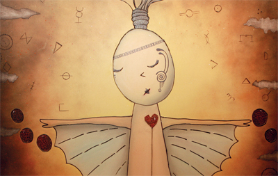 من أجمل اللوحات التي تعتبرها الشماع الأقرب إلى قلبها، لوحة جسدت المرأة في حبها الصادق في صورة الملاك الذي يفيض بحبه للطرف الآخر، ويمنحه مفتاح قلبه ومحبته، وعكست شدة الحب والتفاني في العطاء برسم الغيمة الماطرة بالقلوب، فيما الطرف الآخر يجسد الإنسان الممتنع عن تقبل ذلك الحب ويعكس مدى شره من خلال قرون الشر.
