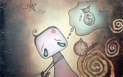 وجسدت في لوحـة فنية صورة حب المجاملات، ووظفت خامات متنوعة لإيصال تلك الفكرة، فقد استخدمت ألوان الإكريليك في رسم الشخصية، وحددتها بأقلام لونية بارزة لإبراز وإظهار التباهي لدى الناس، فيما استخدمت تقنية الكولاج بالاستعانة بقطع وقصاصات ورقيـة لتوضيح الفكرة، وعلى الرغم من الإضاءة المسلطة على رأس الشخص، فإنه يضع قناعاً على وجهه ليخفي ملامحه الحقيقية، ويظهر عكس ما يبطن باسم الحب المصطنع.