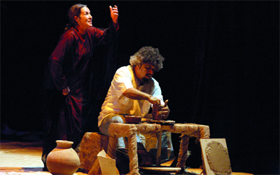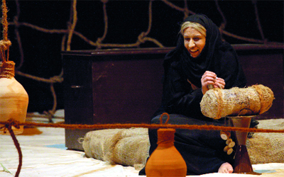 في صحراء الماضي وفي زمن مجهول التاريخ، يظهر رجل ببندقيته التي تلازمه، وخيوط التلي المتدلية من مخدة «كاجوجة» صنعتها أنامل امرأة، ونظرات غزاة يعتدون على أعراض البشر، تاركين ألماً وعذاباً، عرضت مسرحية «أمس البارحة» لفرقة جمعية كلباء للفنون الشعبية والمسرح، أول من أمس، ضمن العروض المشاركة في مسابقة أيام الشارقة المسرحية، في معهد الشارقة للفنون المسرحية. وتدور أحداث المسرحية للمؤلف جمعة بن علي حول قصة شاب قوي صنديد يذود عن أرضه وعرضه ويحارب الغزاة، والمعروف في منطقته بسلاحه الذي لا يفارقه أبداً، والذي اذا رفعه بيمينه دق طبول حرب لا يعرف نهايتها. في المقابل، وعلى المستوى الانساني يمتلك ذلك الشاب مبارك، والذي أدى دوره مؤلف النص جمعة بن علي، قلباً محباً طاهراً ومخلصاً لقريبته حليمة التي عاش طفولته معها وشبّا معاً، لتتفجر علاقة حب بينهما صارت حكاية تروى ويضرب بها المثل.