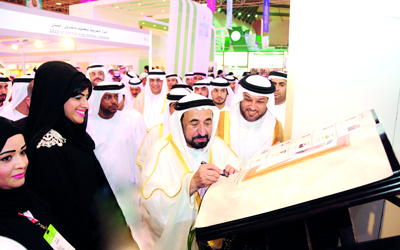 حاكم الشارقة خلال زيارته لجناح «التنمية الاقتصادية في الشارقة». من المصدر