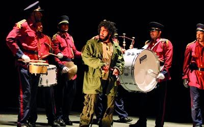 من هذا الاحتفال والمراسم التشريفية، يبدأ العرض، الذي أراد العامري جمهور الصالة ان يشاركوا فيه، إذ فرش السجاد الأحمر ووضع الحواجز الرسمية ليبعد الجمهور الذي وقف في انتظار وصول رئيس البلدية الممثل «محمد اسماعيل» ورئيس الأمن الممثل «حميد سمبيج» ويرافقهم قائد الحرس الممثل «أحمد عبدالرزاق»، الذين دخلوا من بوابة معهد الشارقة للفنون المسرحية وصولاً إلى قاعة العرض واعتلوا خشبة المسرح، إذ كانت في انتظارهم الفرقة الموسيقية العسكرية وأعضاء الأحزاب وأهالي مدينة بونطابور.