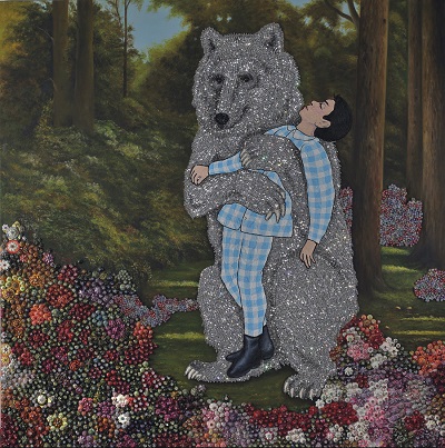وتصور اللوحة دباً ضخماً يحتضن الفنان الذي يظهر في الصورة كطفل نائم.