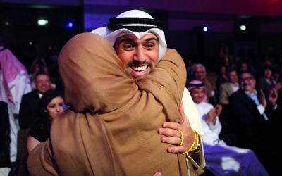 السنعوسي يتلقى تهنئة حارة من والدته بعد إعلان فوزه بجائزة البوكر أمس. تصوير: إريك ارازاس