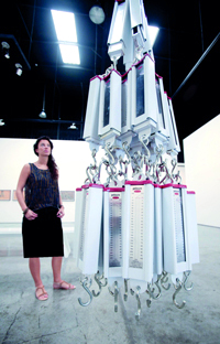 يتخذ محمد كاظم ثلاث وسائط للعمل عليها، فيبني من خلال الموازين عمله الأضخم في هذا المعرض الذي يستمر حتى الثامن من يونيو. ويمثل العمل الذي كوّنه كاظم من مجموعة من الموازين أوضاع الشرق الأوسط، فيمنح الميزان دلالات اجتماعية وسياسية، حيث إن القوى السياسية تجعل لكل منطقة وزنها أو ثقلها وتأثيرها، علماً أن البشر مهما تباينوا في خلفياتهم الثقافية أو الدينية أو حتى السياسية متساوون في الحياة. ويركب الفنان الاماراتي من خلال هذا العمل الموازين، عبر ما يشبه السلاسل المعدنية الضخمة، لتتدلى من أعلى سقف الغاليري حتى الارض بارتفاع يتجاوز المترين. ينتقل بعدها كاظم الى التصوير الذي يعتمد من خلاله على تصوير الذات في استخدامه لجهاز «جي بي إس» الذي يرشد للأماكن، الى جانب الأقمشة الملونة المشدودة بإحكام على ألواح خشبية مربعة الشكل، لتشكل كل هذه الأعمال رحلة خاصة بالبحث في عالمي الثبات والحركة، وإيجاد الحدود الفاصلة بينهما. وأكد كاظم لـ«الإمارات اليوم»، أن أعماله بطبيعتها تنتمي الى البيئة، سواء المحلية أو العالمية، مشيراً إلى أنه يعتمد على الفكرة ثم يلجأ الى المادة التي استخدم الحديث منها، الى جانب التقليدي الذي وظف في العمل بأسلوب معاصر.