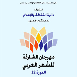 شعراء ونقاد الشعراء المشاركون في الدورة الـ12 لمهرجان الشارقة للشعر العربي، هم: أحمد محمد عبيد (الإمارات)، عارف الساعدي (العراق)، مراد السوداني (فلسطين)، سلمى فايد (مصر)، عيسى جرابا (السعودية)، شيخة المطيري (الإمارات)، علي عبدالله خليفة (البحرين)، محمد العزام (الأردن)، صباح الدبي (المغرب)، عبدالواحد عمران (اليمن)، أحمد الحربي (السعودية)، عامرالعاصي (العراق)، عمار المعتصم (السودان)، شفيقة وعيل (الجزائر)، آدم فتحي (تونس)، خميس قلم الهنائي (سلطنة عمان)، سمير فراج (مصر). ويشارك في الملتقى الفكري، الذي ينظم الثلاثاء المقبل، ثلاثة نقاد، هم: الدكتور سعد البازعي من السعودية، والدكتور رائد عكاشة من الأردن، والدكتور محمد الخطابي من المغرب. |