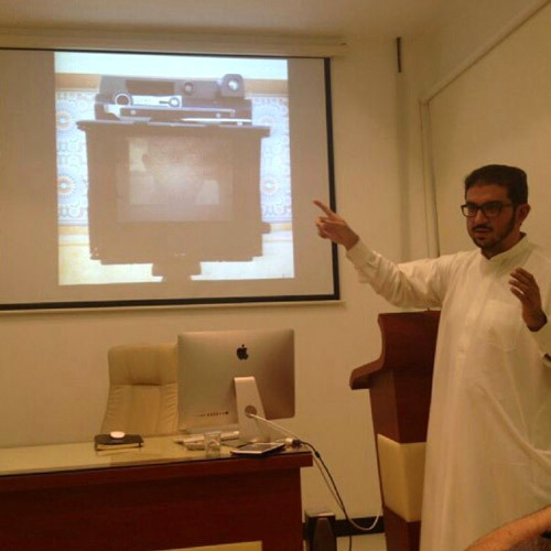 العطار خلال تقديمه تجربته في جمعية الإمارات للتصوير الضوئي. من المصدر
