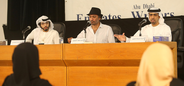 الكعبي (يمين) والمزروعي والمنـصوري خلال الأمسية بـ«اتحاد الكُتّاب» في أبوظبي. تصوير: إريك أرازاس