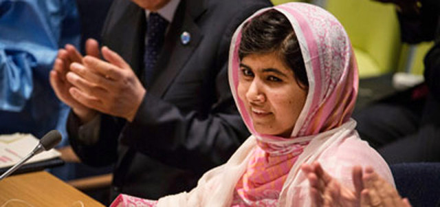 في عيد ميلادها السادس عشر كانت ملالا في نيويورك لإلقاء كلمة في الأمم المتحدة؛ كتبت الفتاة التي سبقت عمرها الخطاب بنفسها، ووضعت شالاً غالياً عليها، يعود إلى قدوتها السياسية الباكستانية الراحلة بناظير بوتو، وتحكي ذلك المشهد: «ارتديت شالاً أبيض من شالات بناظير بوتو فوق قميص شالوار زهري اللون، وناشدت قادة العالم أن يوفروا تعليماً مجانياً لكل طفل في العالم، قائلة: دعونا نحمل كتبنا وأقلامنا. فهذه هي أمضى أسلحتنا. طفل واحد، ومعلم واحد، وكتاب واحد، يمكنهم أن يغيروا العالم».