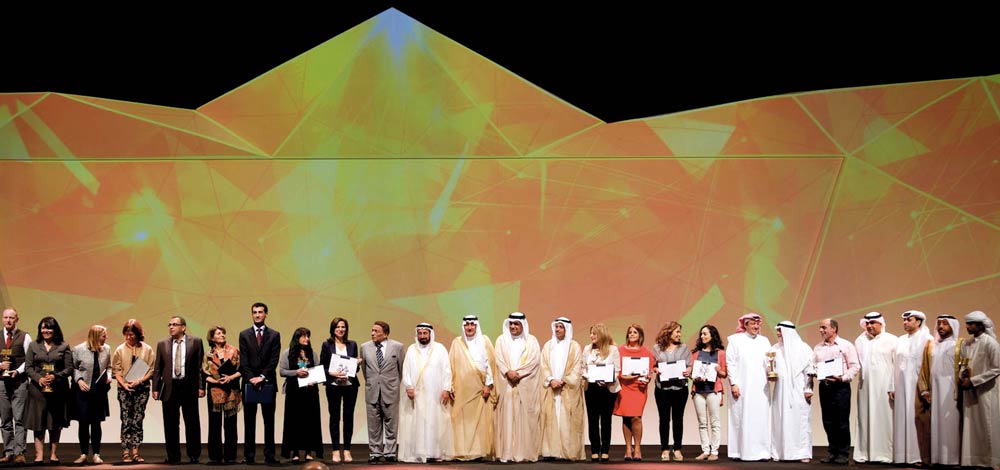 سلطان القاسمي يتوسط كبار الشخصيات والمكرّمين والفائزين بجوائز هذه الدورة من معرض الشارقة للكتاب. وام